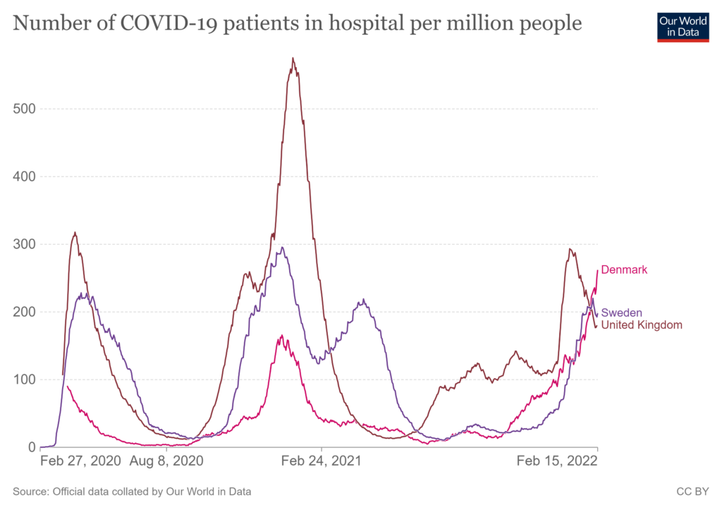 The dominant Omicron variant in Denmark is BA.2. Is this part of the reason for the currently higher deaths? A recent study on hamsters found BA.2 causing more severe illness than BA.1 and being back to liking the lungs, which sounds concerning. However, humans are not hamsters, and you would expect a large clinical change like this to show up in ICU numbers, which it hasn’t so far.