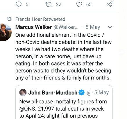 Many instances in the UK of care home residents starving themselves to death. UK politicians are literally getting away with murder. In fact, considering the number of deaths to date and in the future from injections and lockdowns, they are getting away with committing genocide.