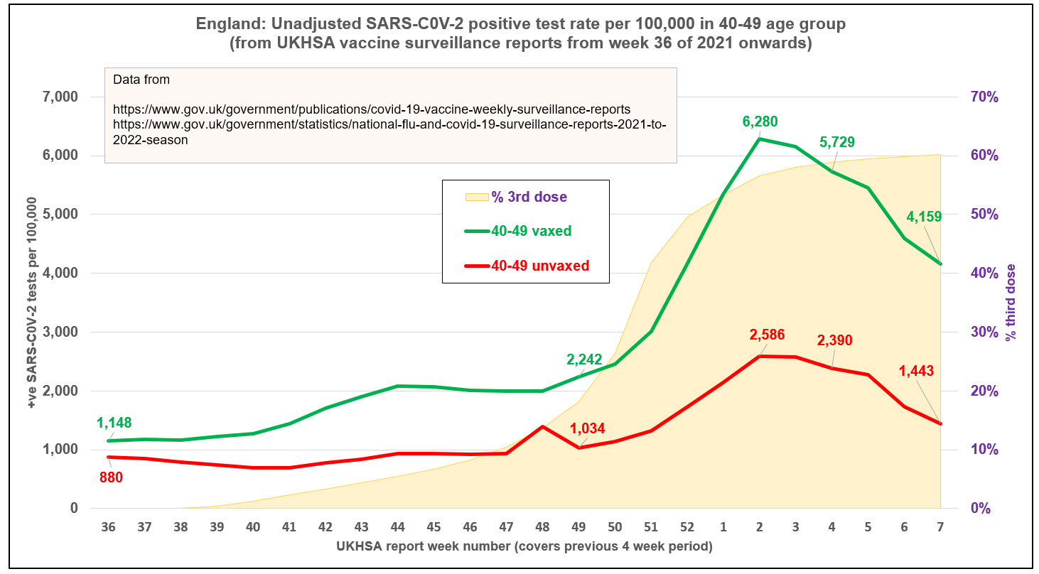 And just look at the history of +ve test rate per 100,000 in the 40-49 age group by vaccination status. I’ve marked on +ve test rates at various points to help the comparison. Note the position doesn’t improve when booster uptake occurs.