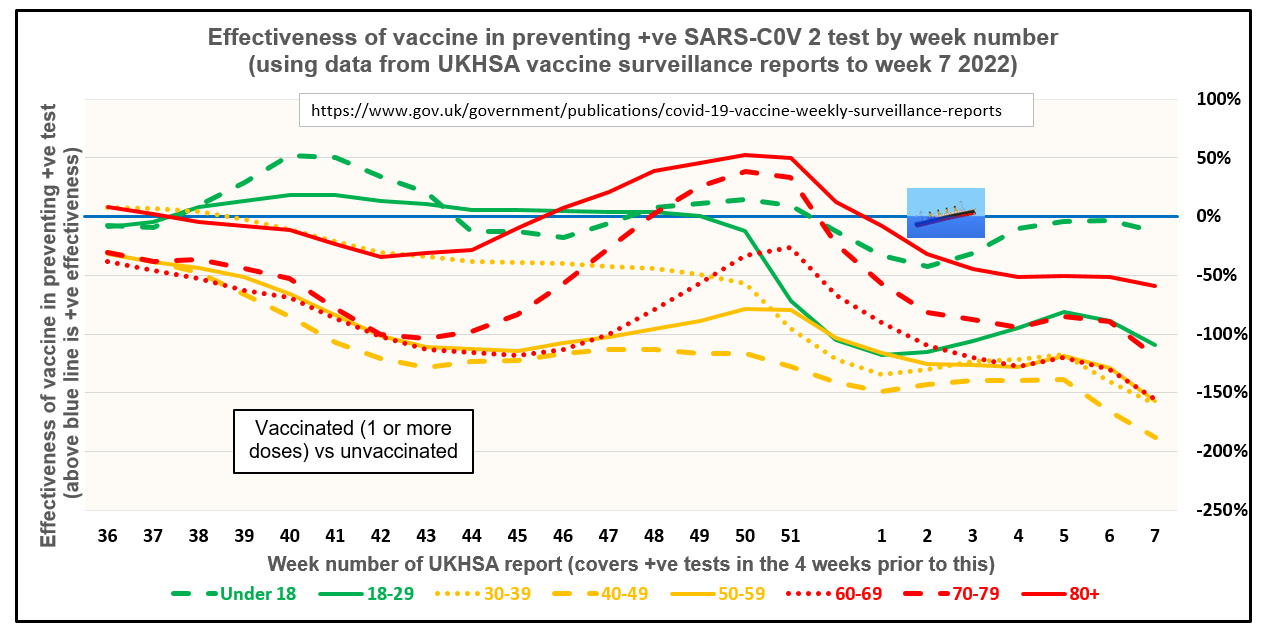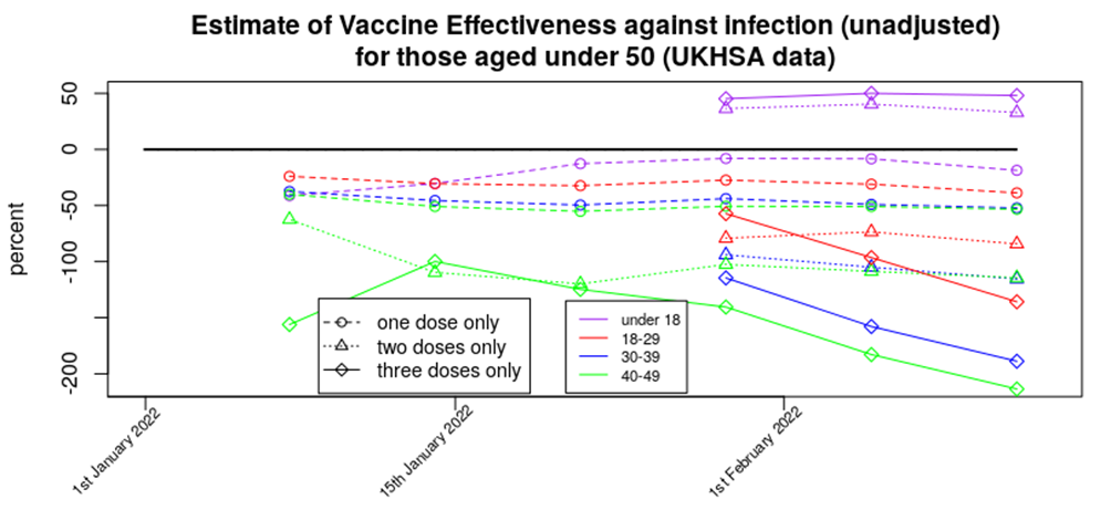 One dose of vaccine appears now to offer a relatively low but stable increase in the risk of infection, two doses offer a stable but higher risk of infection, while the risk of infection appears still to be increasing for those that have had a booster dose – those in their 40s being up to three times more likely to be infected than the unvaccinated. The silver lining in these data is that the impact of the vaccines in terms of increasing infection on those aged under 18 appears to be low; I hope that this reflects their robust innate immune system and isn’t simply because their recent vaccination means that there hasn’t been time for the increased risks to emerge.