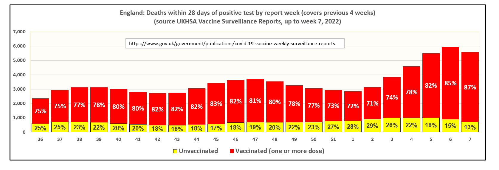 And down to just 13% of deaths within 28 days of +ve test in the unvaccinated and 87% in the vaccinated. Notice how it has been increases in vaccinated +ve test deaths that have been driving things since week 1’s report (covers weeks 49-52) to week 7 (covers weeks 2-6).
