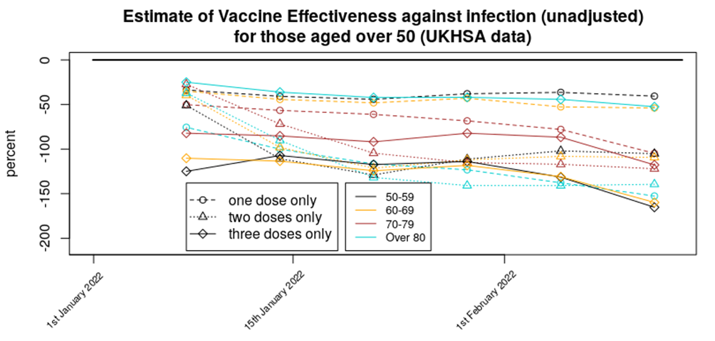The infections data for those aged over 50 paints a different picture. The only clear indication is that all age groups for any number of vaccinations have an increased risk of Covid, compared with the unvaccinated.
