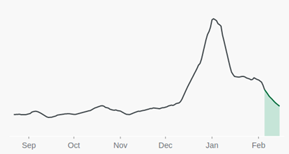 The period covered by the latest report is highlighted in the red rectangle to the right of the graph. The continued decline in vaccine protection suggests that it is possible that variant Omicron BA.1.1 (and/or perhaps BA.2) has achieved further vaccine escape, compared with variant Omicron BA.1, and these variants might even be causing rapid reinfections in the short term. Again, more information is required to explain the disparity between the official and Zoe data.