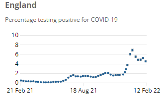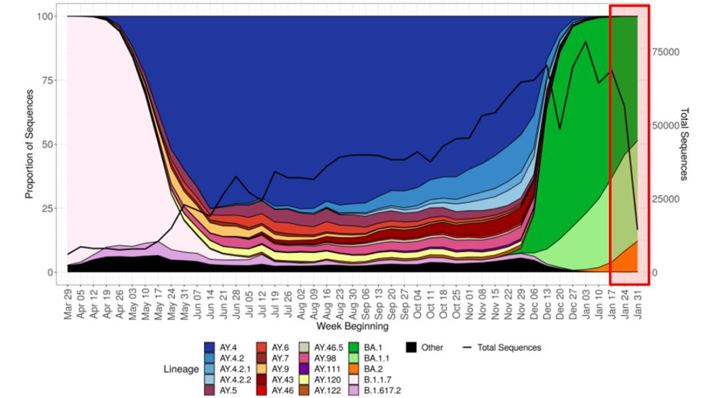 Note how official case numbers have dropped since the Christmas Omicron peak, while the Zoe Symptom Tracker is showing a second peak in the data. The ONS Infection Survey shows a pattern part way between the two. The impact of this complication on our analysis is unclear. It is of note that genomic analysis of a sample of test swabs suggests that the second peak in the Zoe data isn’t simply the BA.2 variant – that doesn’t seem to have infected large numbers in the UK (yet).