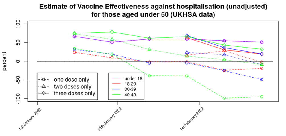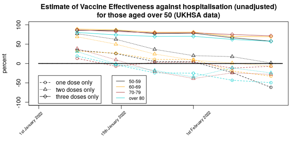 Regarding vaccine protection against hospitalisation, the data are fairly consistent – three doses of vaccine still offer some protection against hospitalisation for all age groups, two doses appear to offer approximately zero benefit, while those having had only a single dose appear to have an increased risk of hospitalisation.