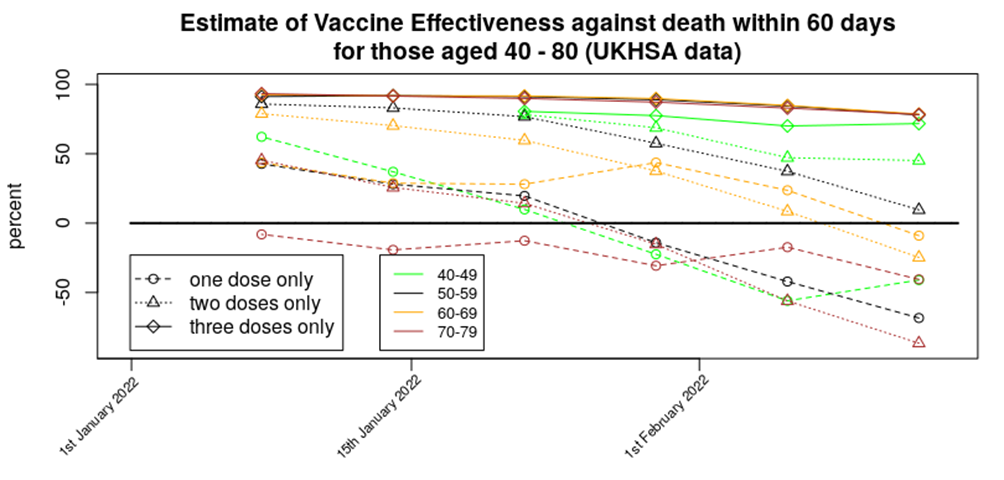 The data for protection against death is similar to the hospitalisations data; a fair amount of vaccine protection remains for those who have received a booster dose, two doses appear to give negligible protection and a single dose appears to offer negative protection (i.e., increases the risk of death). Note that I only included data for 40-80 year olds in this graph; the death rate in those aged under 40 is very low and gives ‘noisy’ results, while the data for those aged 80 or over is complicated by the very large range in vulnerability within the group.