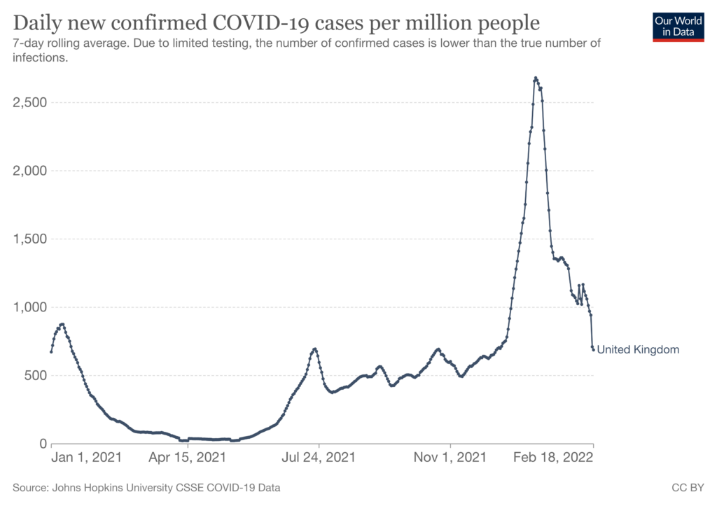 The overall shape of the curve is exactly the same as in the Netherlands. In fact, reported infections per million people peaked at a much lower level here than they did over there – 2,600 compared to 7,300.