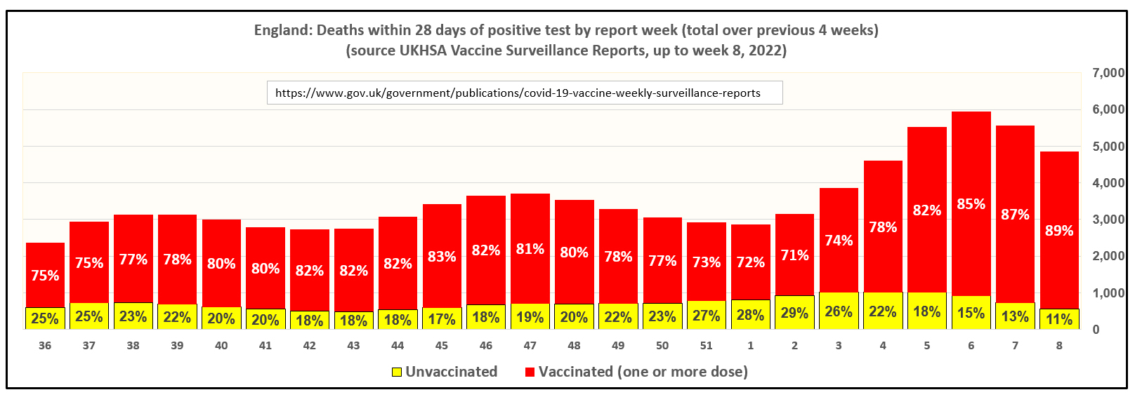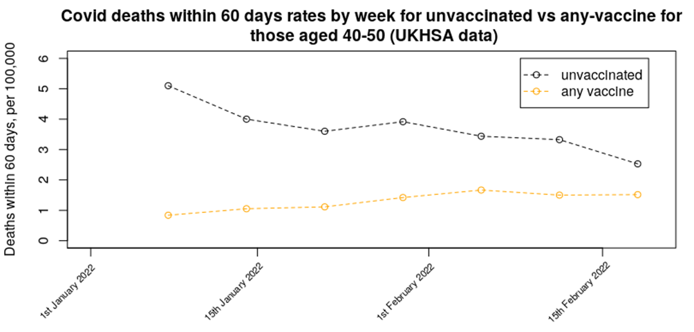 A simple examination of the relative trends of the vaccinated and unvaccinated mortality rates suggests that the two curves will cross over some time between the UKHSA week 10 Vaccine Surveillance Report and the report for week 11, although I note that the data shown in the graph above are for deaths within 60 days; if it is due to a slower disease progression in the vaccinated then the data could well be curtailed as the 60 day point after infection is reached. Any Covid deaths that occur after the 60 day point will be regarded in the data as connected with neither vaccination nor Covid – they’ll be relegated into the realms of ‘short illness’ and ‘sudden death’ that fills too many news reports in recent times.