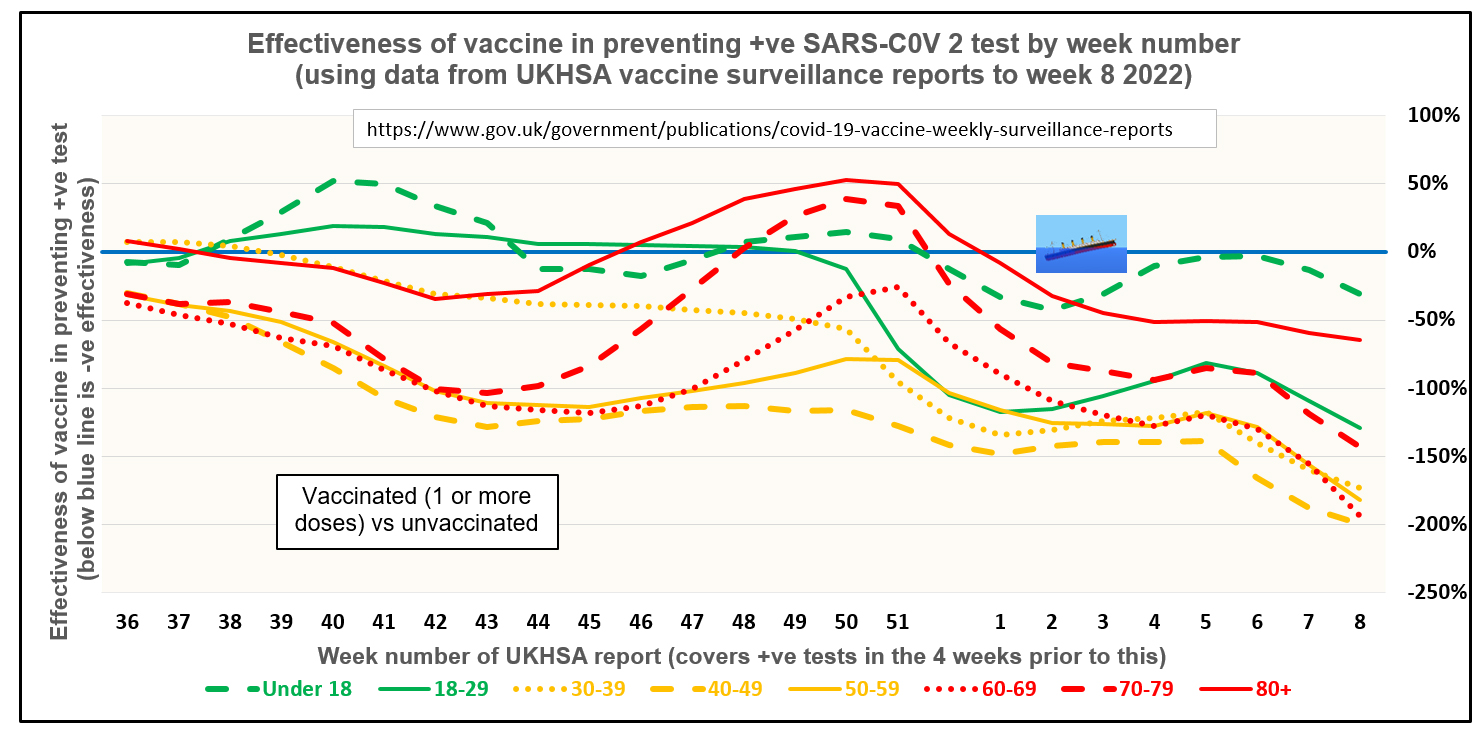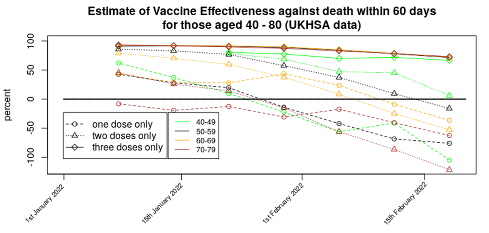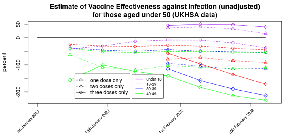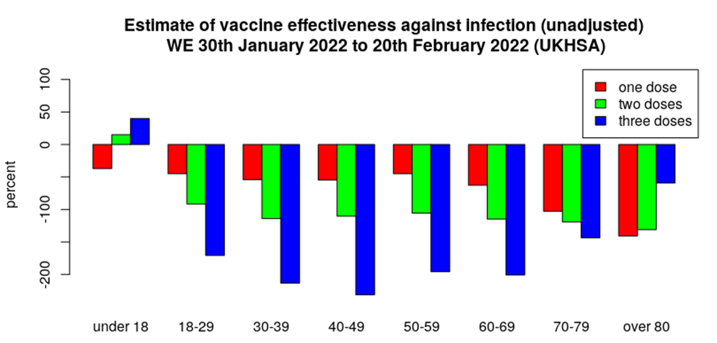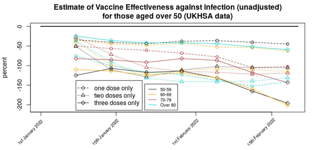 Plotting vaccine effectiveness against infection by time shows that while the vaccine effectiveness for one or two doses is broadly flat, albeit mostly negative, across all age ranges, the protection offered by three doses continues to drop relentlessly. This now appears to be more serious than a simple waning of vaccine protection; the data instead appear to be more characteristic of a dose-effect, with the more doses given resulting in increased risk. Time will tell if this is indeed the case.