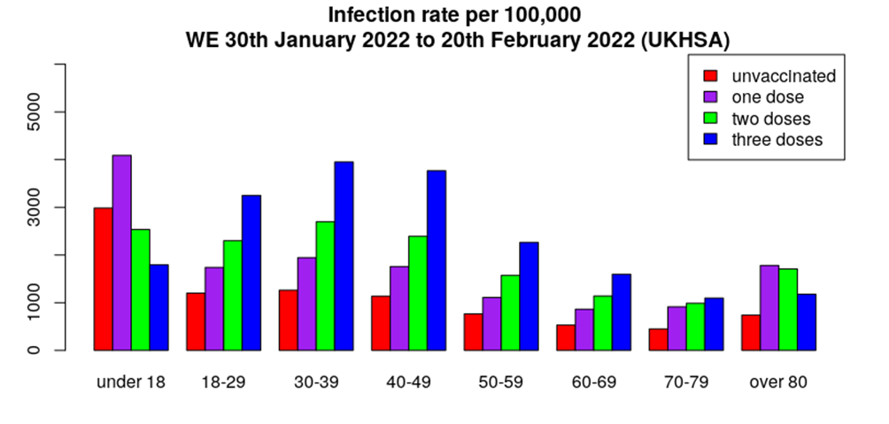 In this week’s UKHSA report the story is much the same as prior weeks – infection rates are still highest in the triple vaccinated except for individuals aged under 18 or over 80; the data for those aged under 18 continue to shift towards decreasing vaccine protection, while there’s not much change in vaccine performance for those aged over 80. At least infection rates are declining across the board as this January’s Omicron wave recedes into history.