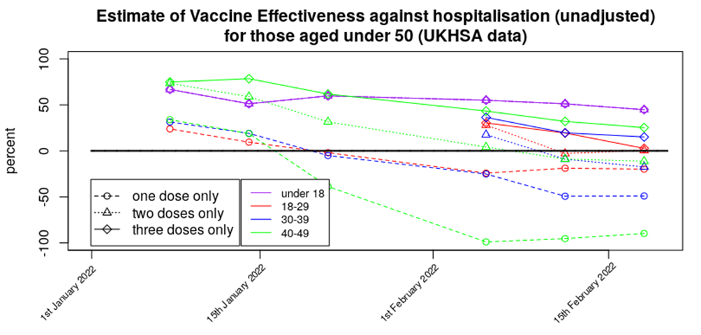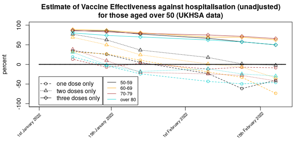 Protection against hospitalisation shows a similar picture to last week’s data, with a continued drift downwards in the protection offered by three doses. The protection offered by three doses appears to be better in those aged over 50; it isn’t clear why this should be the case, although I note that the immune system does change with age, and particularly for those aged over 65-70 – it might be that the vaccines offer more benefit for those suffering from age related immune dysfunction. The situation with one or two doses appears to be drifting downwards with two doses increasing risk of hospitalisation slightly (slightly negative protection) and one dose being associated with substantially increased risk of hospitalisation risk.