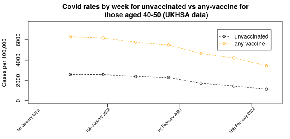 The above graphs show vaccine effectiveness and thus don’t really indicate the impact of the vaccines on the progression of each Covid wave – I think it might be instructive to show a little data on how the vaccines appear to have impacted on Covid rates since the start of the year. I’ll focus on one age group – those aged 40 to 50 – as this will keep the graphs relatively simple, but note that similar trends are seen across all age groups. I’ll also lump all vaccinated together into one group called ‘any vaccine’.