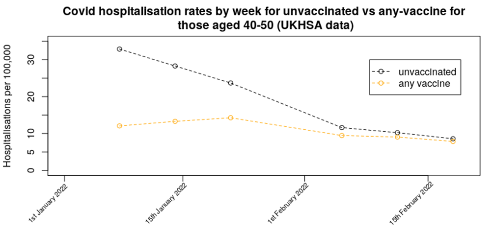 The data for hospitalisations, however, shows a different pattern. While the hospitalisation rate in the unvaccinated has declined significantly since the start of the year, the data for those having taken any vaccine shows a much more subdued reduction, with signs of a slight peak in hospitalisations around the latter part of January. Note how the hospitalisation data ends with there being little difference in hospitalisation rates between the unvaccinated and those having taken any vaccine.