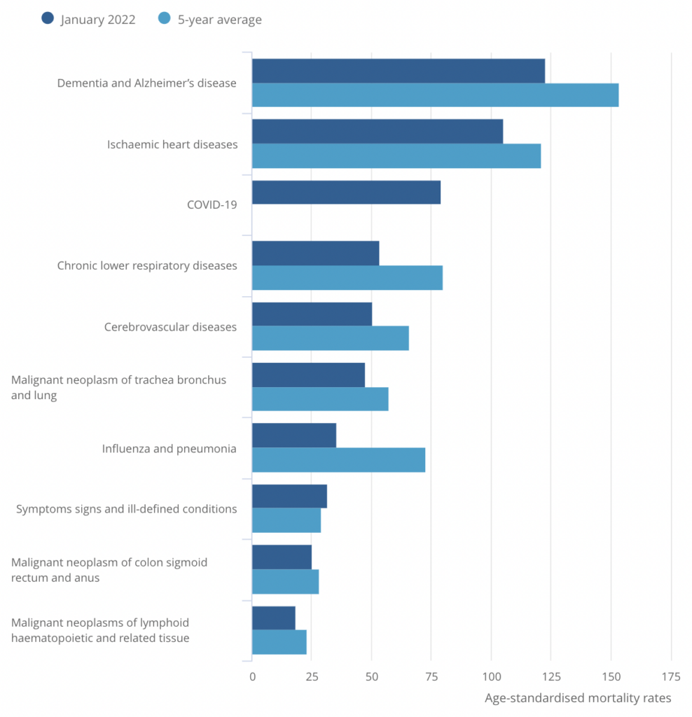 Age-standardised mortality rates for leading causes of death other than Covid were well below their five-year averages. However, the ONS now computes the five-year averages from 2016–2019 plus 2021, rather than 2015–2019, meaning that the latest figures are not directly comparable with those for previous months.