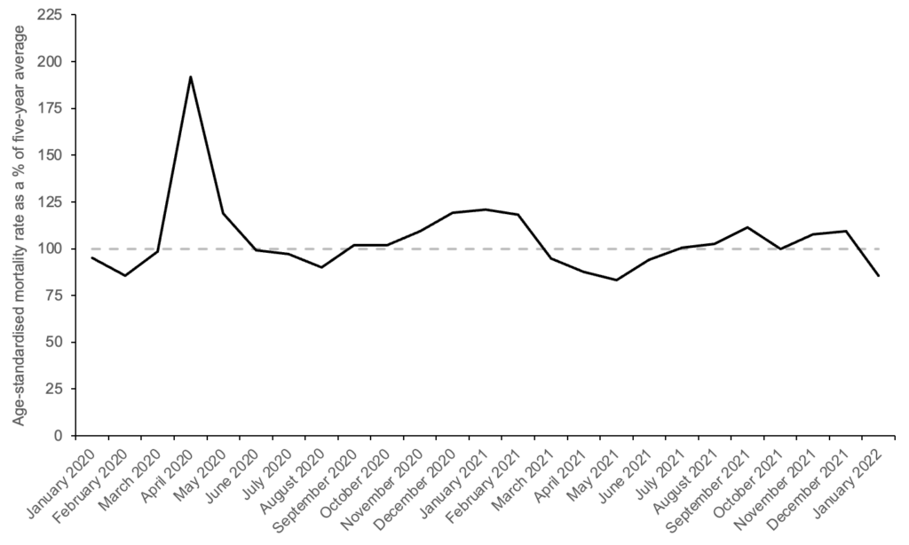 In fact, if you take the average age-standardised mortality rate from June of 2020 to January of 2022, and compare it to the five-year average, there was only 2% excess mortality over this time period. In other words, there’ve been hardly any excess deaths since the end of the first wave.