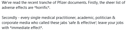 The first batch of the Pfizer trial data was released today,1st March. Thanks to a Trump elected judge, Pfizer’s request to seal the trial data for 75 years was overturned. Forget the War narrative, this is where attention should be focused!