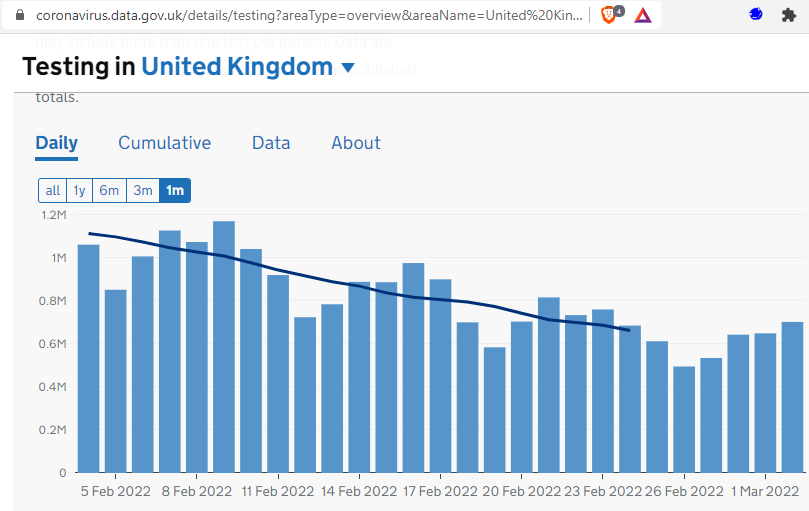You’re right, and even an increased rate of positive tests (the recent data are marked as incomplete, and there’s no figure for 3 March, so we can’t really compare accurately yet) wouldn’t mean much. Now that free tests are being stopped in England, people there are more likely to test sparingly – i.e. only if they’re symptomatic or otherwise likely to have it.