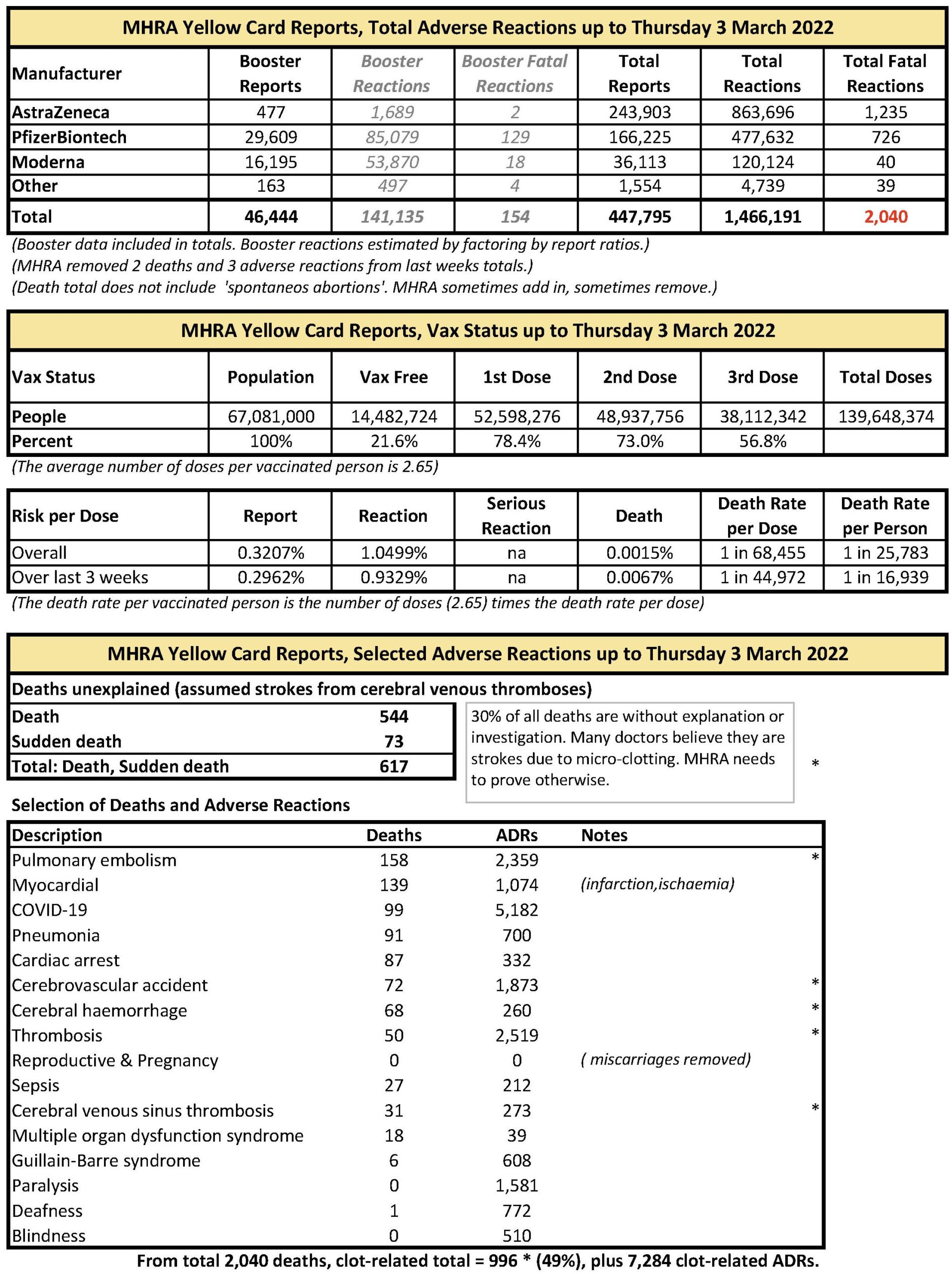 According to an updated report published on February 16th, the MHRA Yellow Card reporting system has recorded a total of 1,461,822 events based on 446,382 reports. The total number of fatalities reported is 2,022.