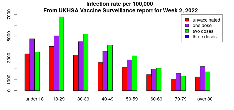 Note how the decline in deaths in unvaccinated, single jabbed and double jabbed is very prominent, but the death rates in the triple-vaccinated appear to not yet be declining significantly. Also note how the deaths in the unvaccinated (red bars) appear to lead the changes, with deaths in the vaccinated following a week or two later. It isn’t clear why this might be.