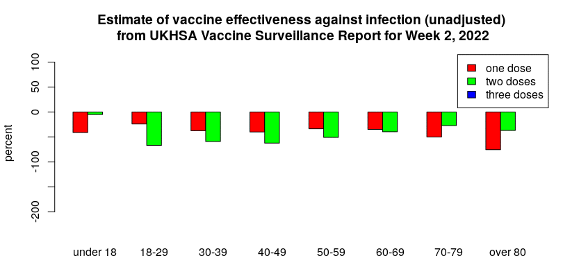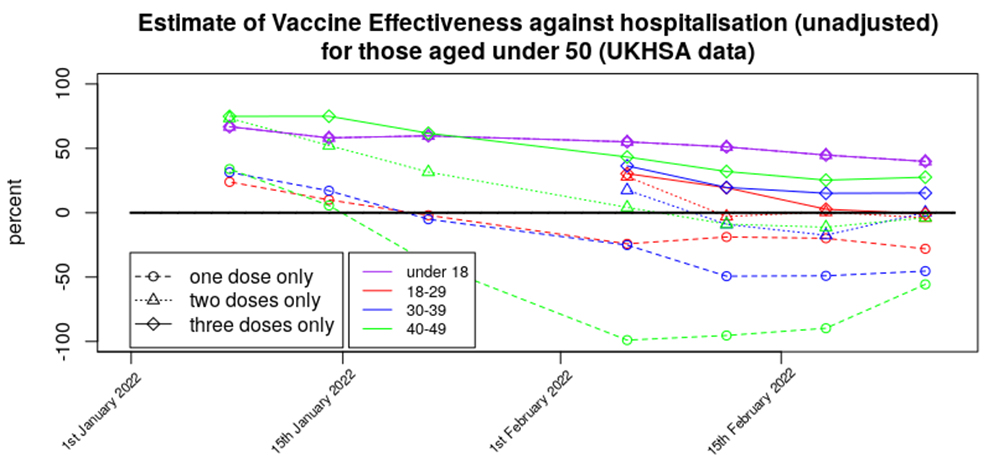 Displayed in this way it can be seen that apart from in those aged under 18 we’re seeing a broadly level but negative vaccine effectiveness for one and two doses, with a rapidly declining vaccine effectiveness for three doses of vaccine.