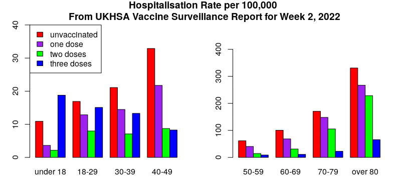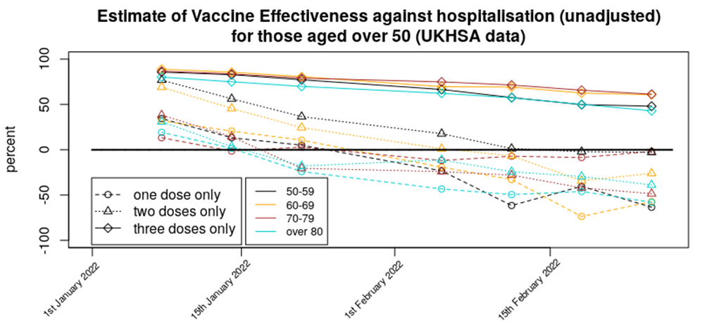 This is a very good point — I should clarify it in the text. The answer is ‘we use data as supplied by UKHSA’, which isn’t as simple as you’d imagine. Unvaccinated is completely unvaccinated. It definitely doesn’t include the period immediately after vaccination (well, ‘definitely‘ according to the UKHSA) One dose is at least 21 days after vaccination. But it also includes those within 2 weeks of their second dose. We aren’t provided with the data to separate out the one dose (only) individuals from those within 2 weeks of their second dose. Two doses is 14 days after vaccination. But it also includes those within 2 weeks of their third dose. Again, we aren’t provided with information to separate out infections/hospitalisations/deaths in those just vaccinated with their third dose. Three doses is those at least 14 days after the third jab. So, it is a fair point to consider that elevated infections/hospitalisations/deaths in the one and two dose groups is affected by increased rates in individuals immediately after vaccination. The one bit of information that we’ve got that isn’t being presented is data for those within 3 weeks of their first jab — would people like this to… Read more »