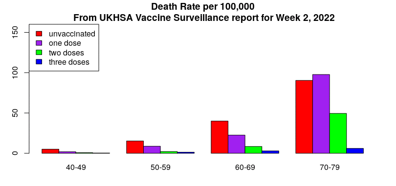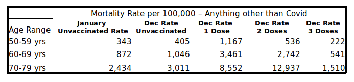 Examination of the table above shows that the January mortality rate in the unvaccinated is broadly comparable with their December mortality rate, but the mortality rate in those given a booster is about 45-50% lower than the rate in the unvaccinated. But perhaps this simply means that the vaccines make people healthier? The answer to that comes in the mortality rates in those having received only one or two doses of vaccine – in all cases their mortality rate is multiple times that in the unvaccinated, i.e., it appears that the ‘deaths saved’ in the triple vaccinated are simply moved into the one and two vaccine dose group; the reason that the rates are so much higher is because there are relatively few in the one and two vaccine dose groups, particularly in the older age ranges, and so a relatively small number of deaths gets concentrated into a very small group, increasing the mortality rate for the group as a whole.