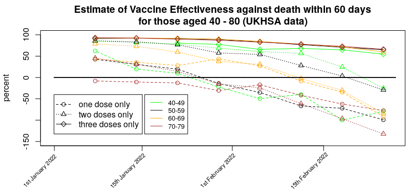 This then brings us back to that graph of mortality rates in vaccinated (any vaccine) vs unvaccinated in those aged 40 to 50 – most of the ‘healthy vaccinee’ effect appears to have worked its way out of the unvaccinated data (most of those close to death and spared from vaccination have now died), leaving only the single and double jabbed data to show the ‘healthy vaccinee’ effect. Thus by considering all deaths in anyone that has received any vaccine we should remove the ‘healthy vaccinee’ effect. As the graph in question now shows the unvaccinated and vaccinated groups to collectively have similar mortality rates, it is very likely that the vaccines no longer offer any protection against death in those aged 40 to 50 years. I’ll examine this effect for other age groups next week, so long as Russia doesn’t invade Wiltshire.