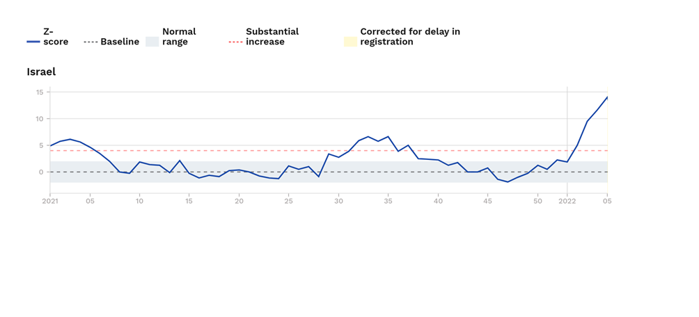 Excess mortality in Israel. Last week I noted that excess mortality was high in Israel in those aged over 65 years. I’m sad to say that things have got even worse; in this weeks Euromomo release their excess deaths rate for those aged over 65 has increased to approximately 14 standard deviations above the normal level for this time of year. Hopefully the death rate in Israel will start to come down soon.