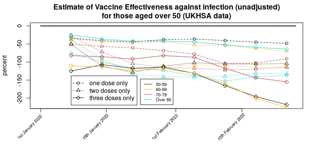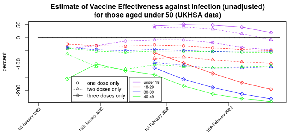 “It is of note that neither the Zoe app data nor the ONS data offer sufficiently detailed information by vaccination status (the Zoe data used to show this but they stopped just at the point where vaccine effectiveness turned negative).”