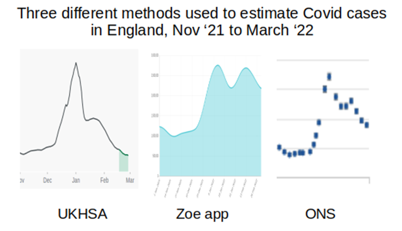 I’ve not included scales in the above, but have adjusted the graphs to cover approximately the same date range (the start of November 2021 to start of February 2022); what is important is the shape of the curves. The UKHSA data suggest that cases are now somewhat below the level they were at last November, the Zoe app data suggest that case levels are now approximately double what they were last November, and the ONS data similarly suggest that case loads are now approximately double the level seen last November. (Note that the UKHSA data are daily infections, while the Zoe app and ONS data are both ‘currently infected’; while this will have an impact on the data, this should not be to the extent suggested in the above graphs.)