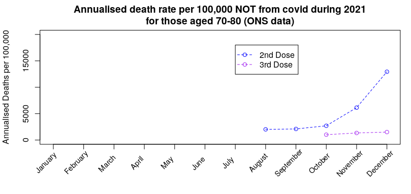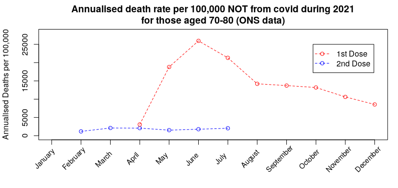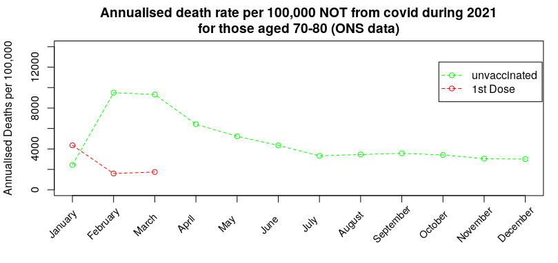 Consider first the first dose of vaccine and what happened to non-Covid deaths in the unvaccinated for those aged 70-80: