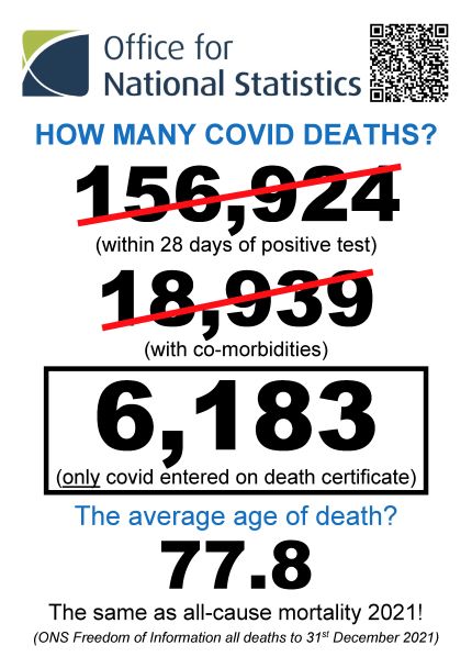 That’s right, just 6,183 people in two years have died from covid with no pre-existing conditions and no co-morbidities. Compare that with the bogus (aka ‘patent’) headline figure of around 157,000. This is 25x the actual figure.
