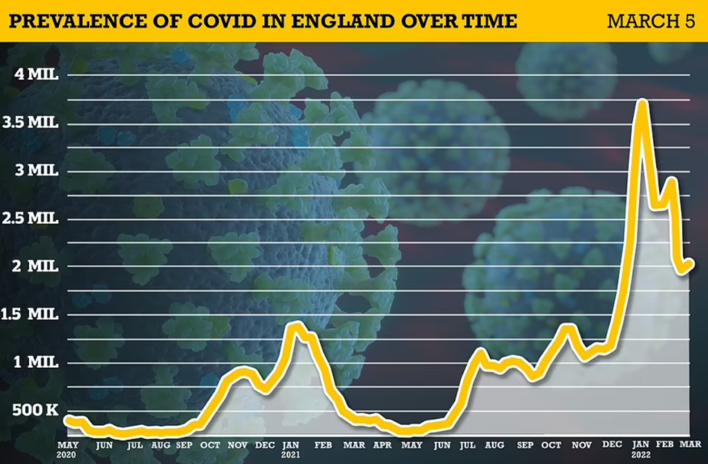 The surveillance report also found infections were rising in England before all Covid laws were lifted on Freedom Day, suggesting the transition towards ‘living with Covid’ is not solely to blame for the latest surge.