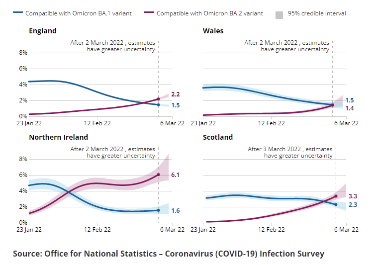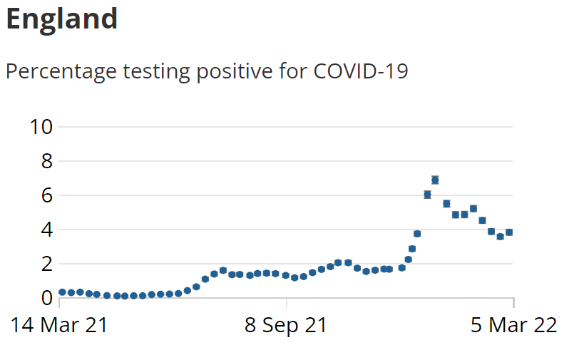 As MailOnline points out, Sajid Javid’s claim that the rise is linked to the end of restrictions (mainly the requirement to self-isolate) on February 24th is contradicted by the ONS data, which show infections rebounding from around February 19th (see above).