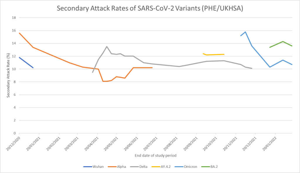But how accurate are these estimates of infectiousness? The UKHSA (and previously PHE) publishes estimates of the secondary attack rates (SARs; the proportion of contacts an infected person infects) of the coronavirus variants in its Technical Briefings. I have plotted some of them in the chart below.