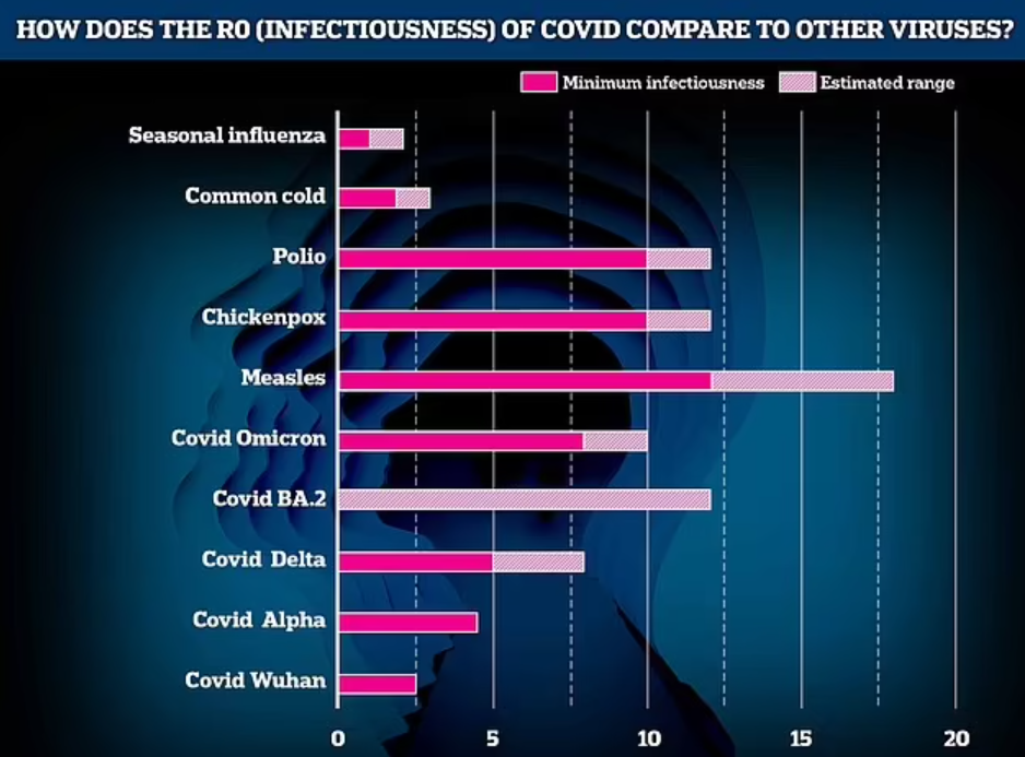 A former World Health Organisation (WHO) official has claimed that the BA.2 subvariant of Omicron has a basic reproduction number (R0) of around 12 (each infected person passes it on to 12 others), making it as infectious as measles, the most contagious disease known, and nearly six times as infectious than the original Wuhan strain (with an R0 of 2.5). Here’s the report in MailOnline.