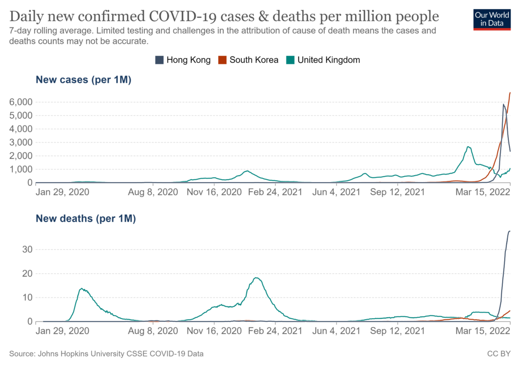 The reality, though, is that Hong Kong’s Omicron wave has been dropping fast for 10 days now, and deaths will likely follow shortly. Note that unlike cities in China, Hong Kong has not been locked down, and a ban on gatherings of more than two is only being brought in now (why do politicians bring in extreme measures when infections are dropping?), meaning lockdown can’t be credited with putting the outbreak into reverse.
