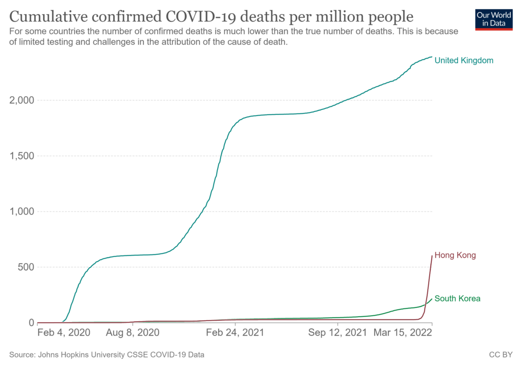 In fact, Hong Kong has proved what we already knew, that NPIs – which were ruthlessly enforced in HK- merely delay rather than prevent COVID fatalities. Indeed, it looks like they have also suppressed natural immunity making things worse not better. The authoritarian tendencies in the civil service, whose main priority is not to upset the mainland, have totally wrecked the economy – at least in the short term – and caused undue misery. One country two systems and the worst of both.