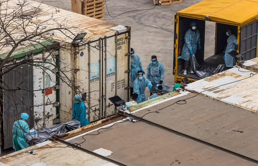 Here are the pictures of shipping containers being used for bodies and bodies stored in bags on wards – presumably largely a consequence of strict Covid protocols that require those infected with Covid and the bodies of those who die with it to be kept separate from others.