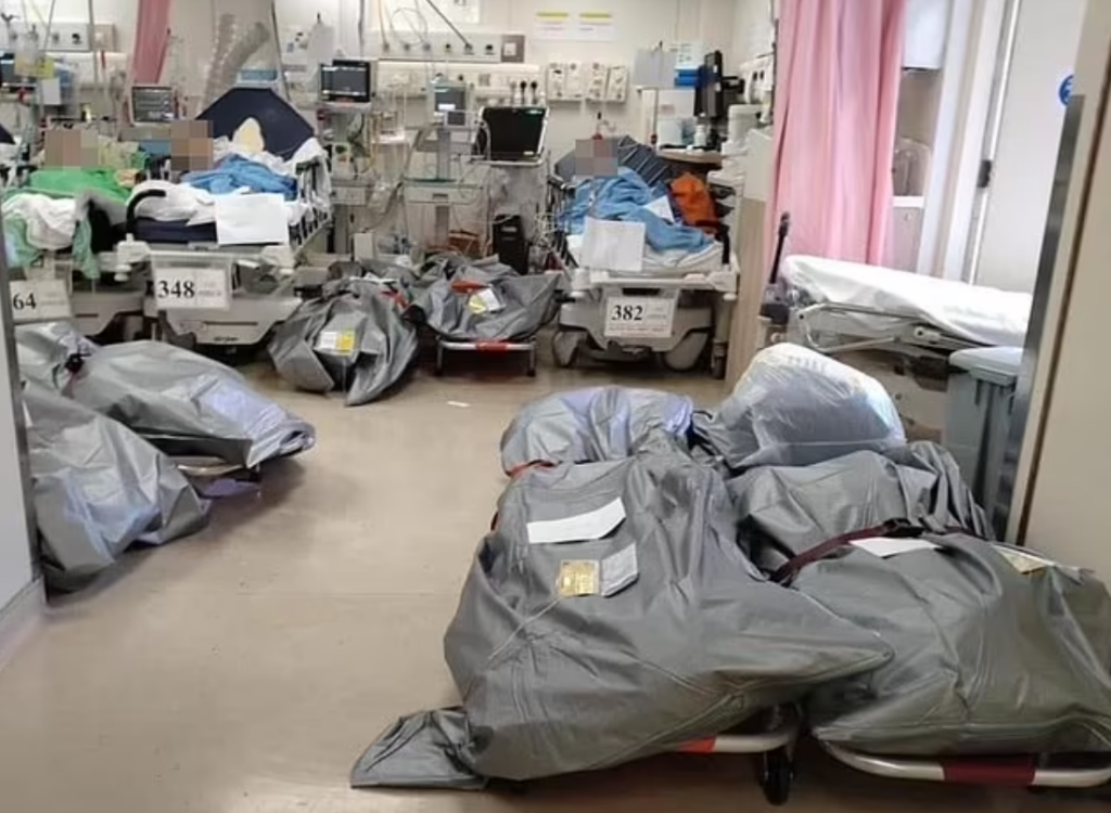 The shocking images come just five days after bodies were seen lying abandoned on stretchers next to living patients in a Hong Kong hospital.