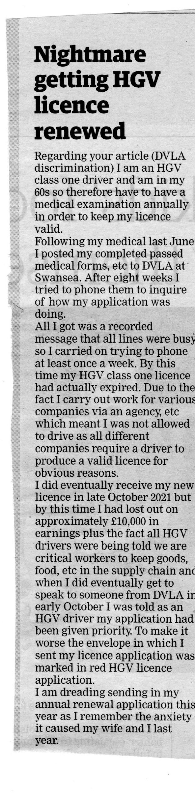 Yet another total failure of a branch of Government. This is having a real and serious effect on people, some of whom, like the cutting herewith of HGV driver writing to “The Eastern Daily Press”, are losing big chunks of income. We had all the hoo-ha about HGV drivers last year, yet the DVLA are incapable of withdrawing the digit and doing the job they’re paid for.
