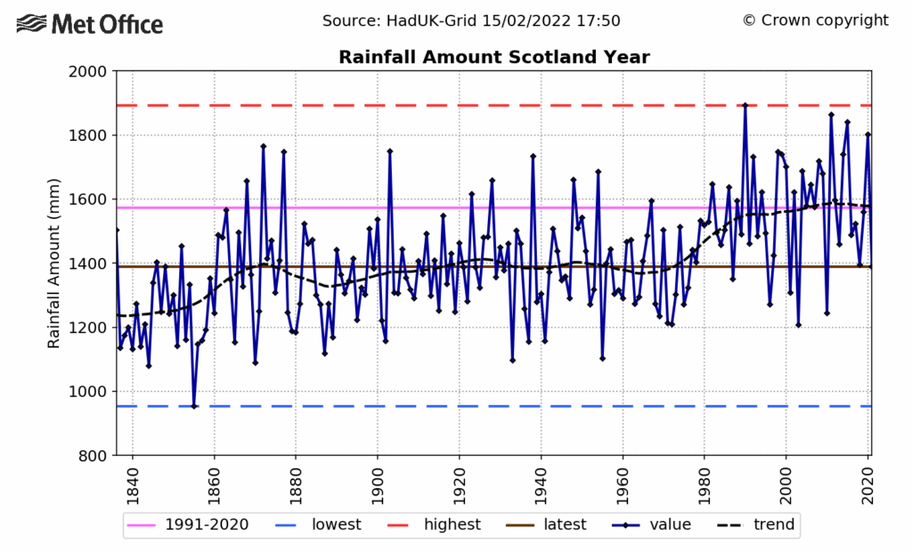 Many of the forecasts for future climate change in Scotland were produced in 2018 by the Met Office Hadley Centre. A useful summary of the predictions was compiled by the Scottish Government-funded Adaptation Scotland, and can be seen here. Assuming the current ‘medium-high’ carbon dioxide emissions scenario, it said that temperature would rise by 1.5°C by 2050. By 2080, the temperature could rise to 3°C, with a top limit of 5°C. Back in the real world, the Met Office graph would shoot up nearly vertically with a high point well past this article’s headline. Inaccurate doesn’t even begin to describe it!