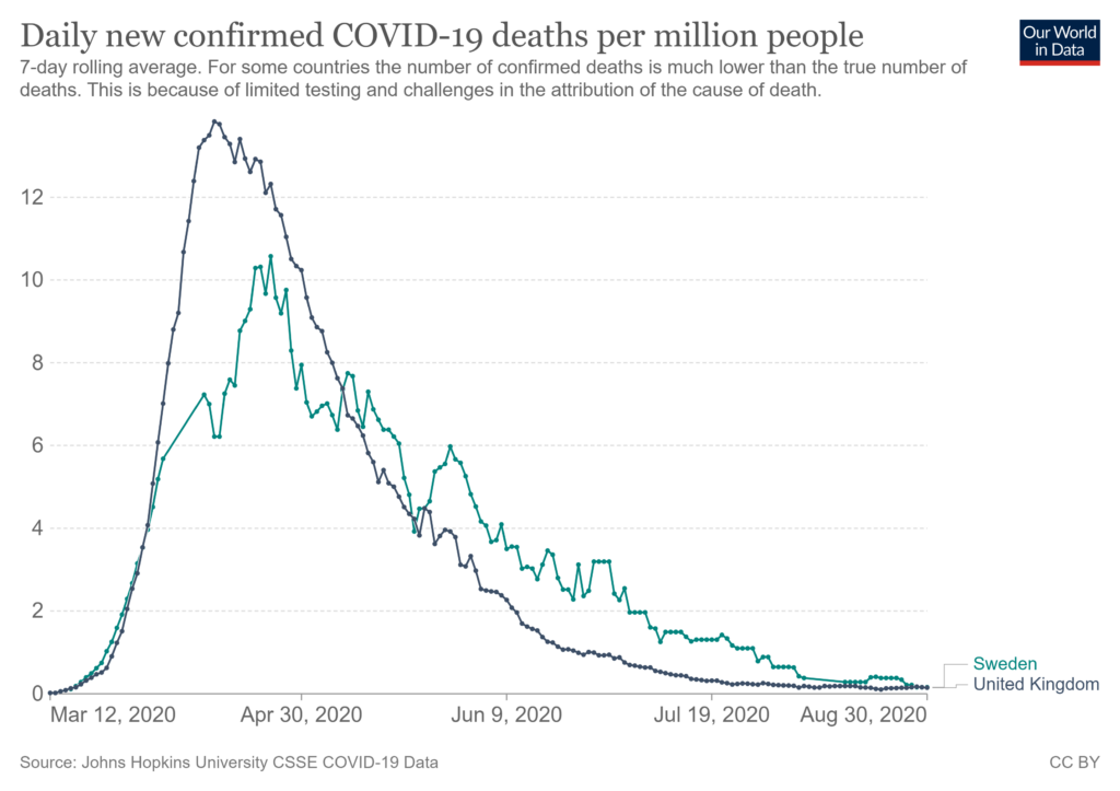 The problem with the Sweden vs UK comparison, though, is that lockdown lovers will claim that Swedes reduced social contact voluntarily and so in effect did very similar things, albeit by choice rather than by mandate. And they probably have a bit of a point.