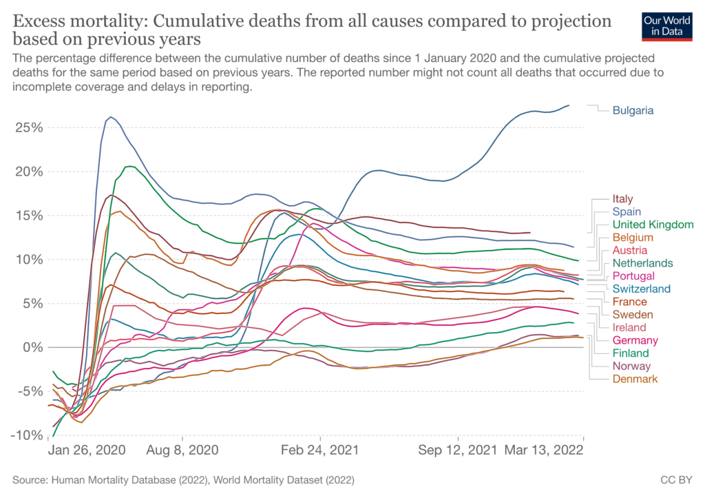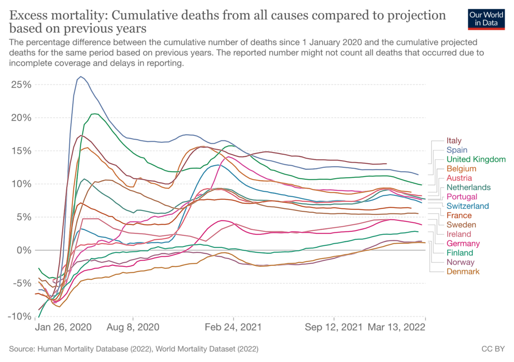 At the end of April 2020, the difference between the country with the greatest excess mortality (Spain) and the country with the least (Denmark) was 31 percentage points. By December of 2020, this range had fallen to 19 percentage points. And as of mid-March of 2022, it is down to 12 percentage points.