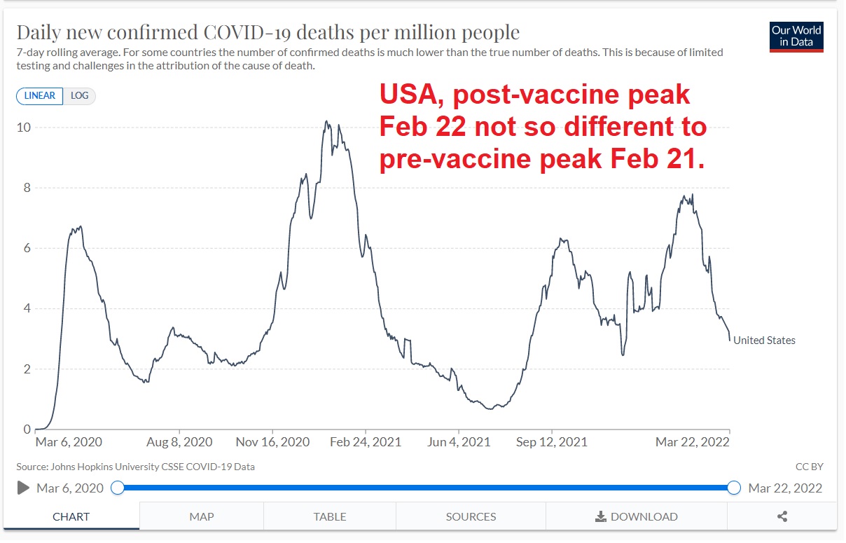 The chart below shows deaths in the USA. It doesn’t look like the vaccines made much difference.