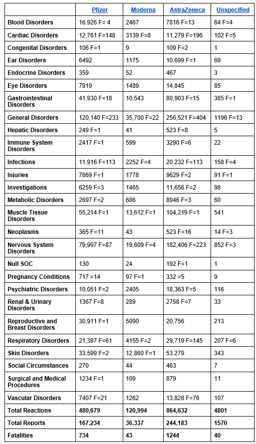 According to an updated report, as of March 9th the MHRA Yellow Card reporting system has recorded a total of 1,471,106 events based on 449,324 reports. The total number of fatalities reported is 2,061.