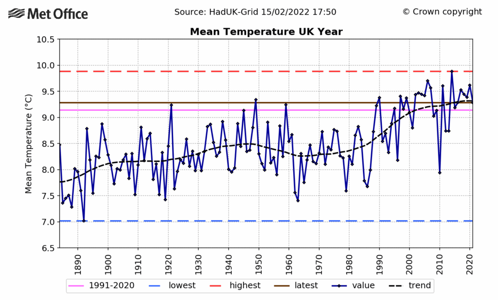 Last year’s classifications were based on 1981-2010 data and this has now been moved to 1991-2020. It is not clear why the Met Office used data last year up to 2010, when 2020 data were available at the time. The cynical might observe, however, that the Met Office delayed ditching warming figures from the 1980s and adding the flatlining trend from the 2010s. Even with the jump in warming from the 1990s, the current level is only about 0.2°C above the 30 year average. If the 1990s were removed, the increase over 20 years would be minimal and within any margin of heating error. In effect, the Net Zero agenda is being followed, despite warming disappearing from both the local and global temperature records.