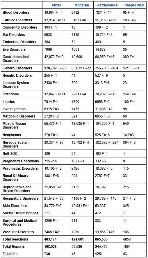 According to an updated report, as of March 23rd the MHRA Yellow Card reporting system has recorded a total of 1,475,298 events based on 450,567 reports. The total number of fatalities reported is 2,075.
