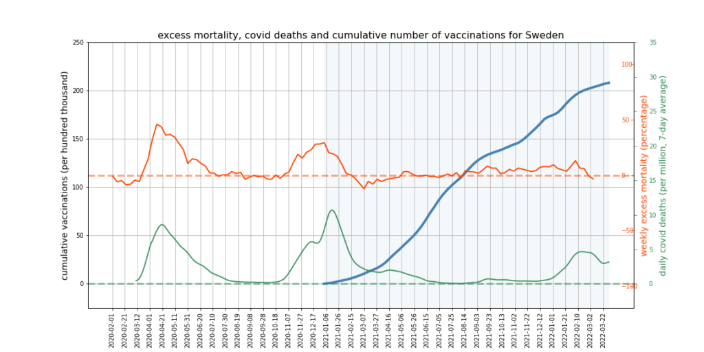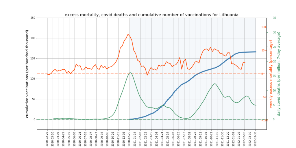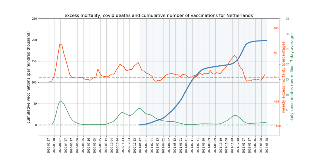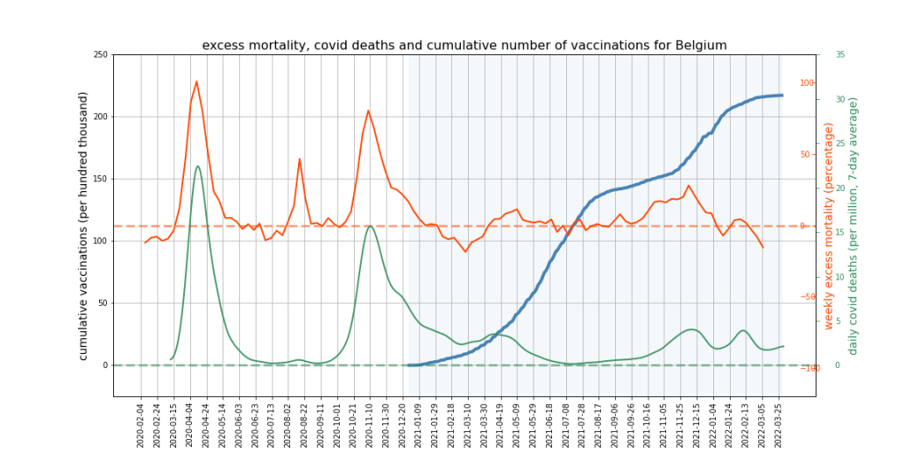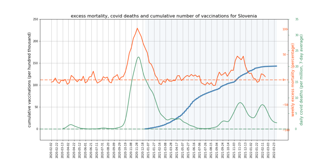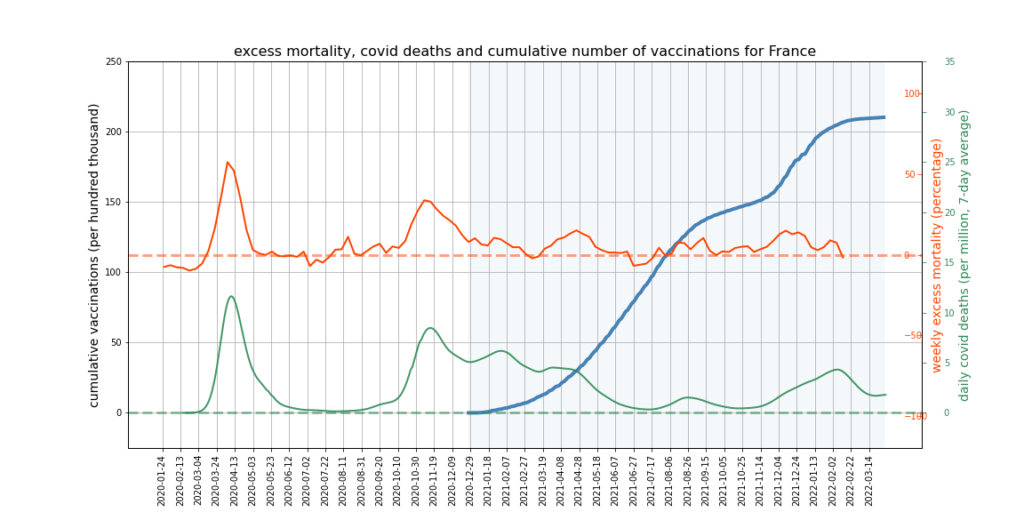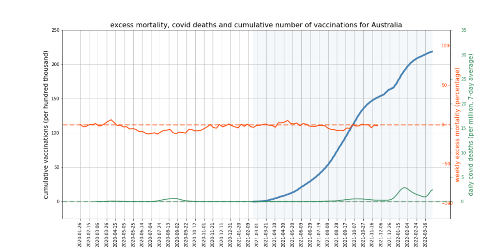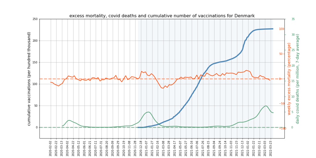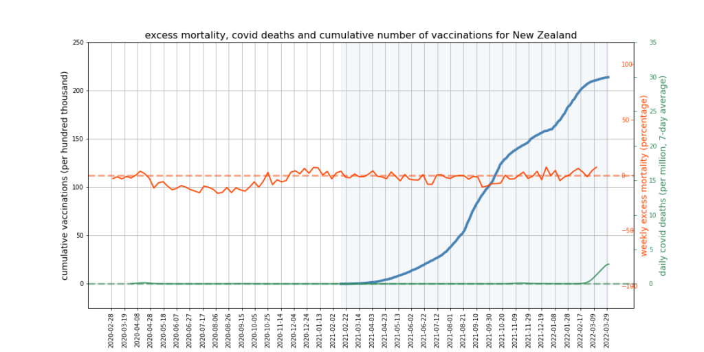 The graphs below show Covid deaths, excess deaths and vaccine doses for 42 countries, mostly in Europe but also Australia, New Zealand and Israel. In many of them a broad rising trend in excess deaths is discernible since the vaccine rollout began, with some more pronounced than others. The large impact of Covid waves and mortality displacement is also clearly visible. In many of the countries, the rollout (particularly to the elderly) was done during the winter 2020-21 Covid wave, obscuring a potential vaccine injury signal, and the subsequent mortality displacement has a similar effect. In Australia and New Zealand, the very mild winter ‘flu season’ (when flu was not around) during the rollout in 2021 resulted in low excess deaths in some of the colder months such as September, also obscuring a possible signal – though notably the winter months of June and July and, in New Zealand, August did not have the low mortality you would expect in a winter without flu. In the northern hemisphere, excess mortality in the winter just past was depressed by the mildness of Omicron, again obscuring a possible signal.