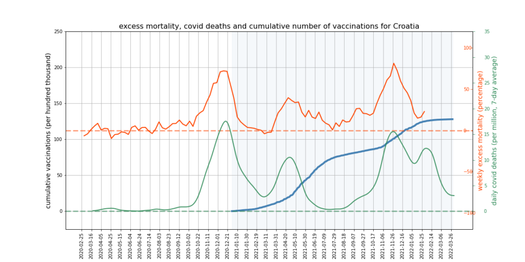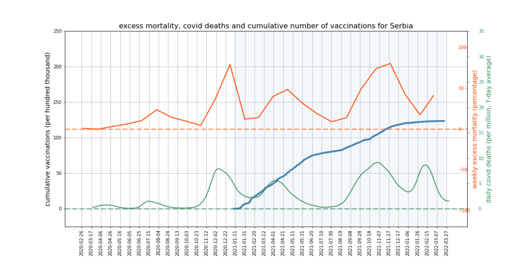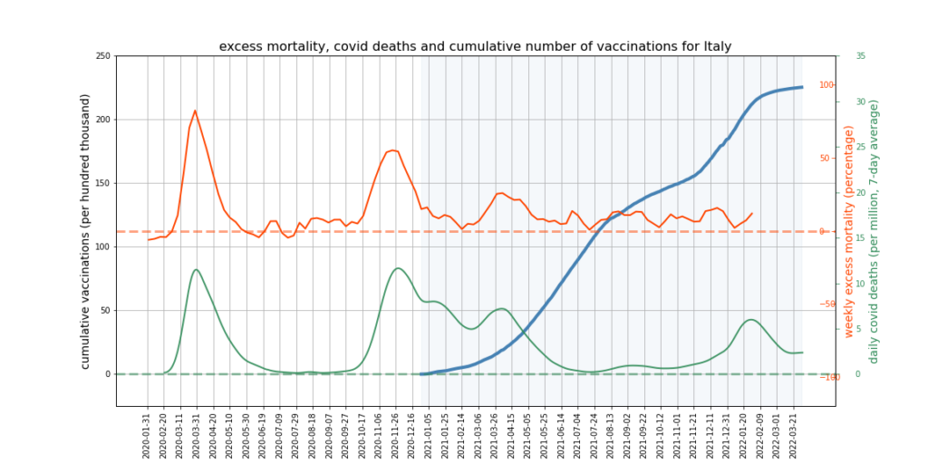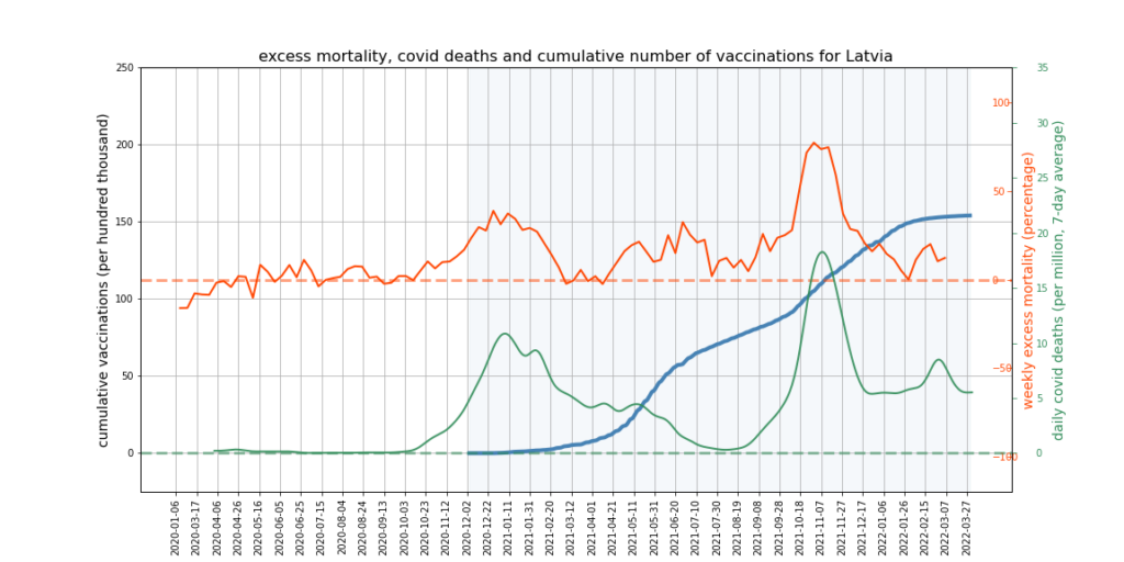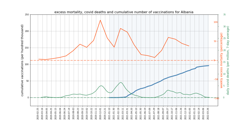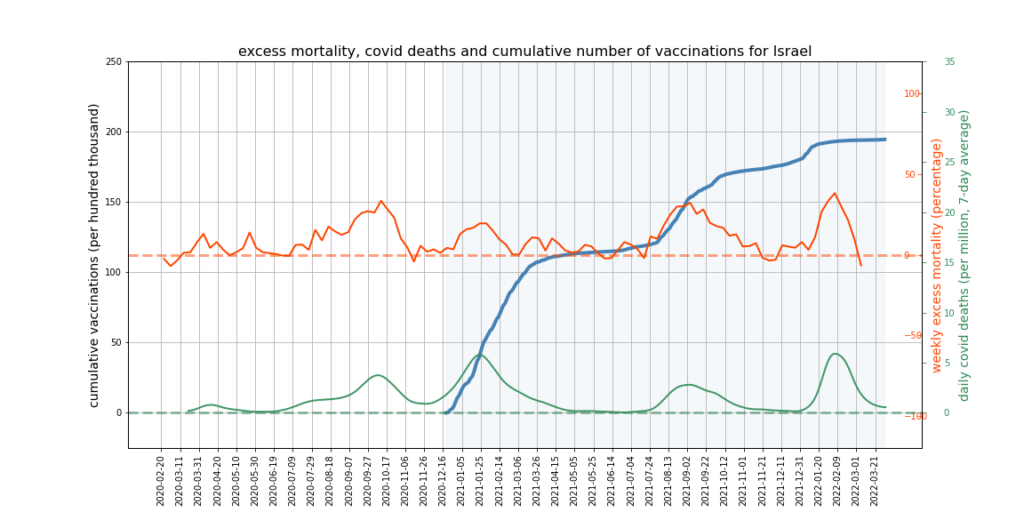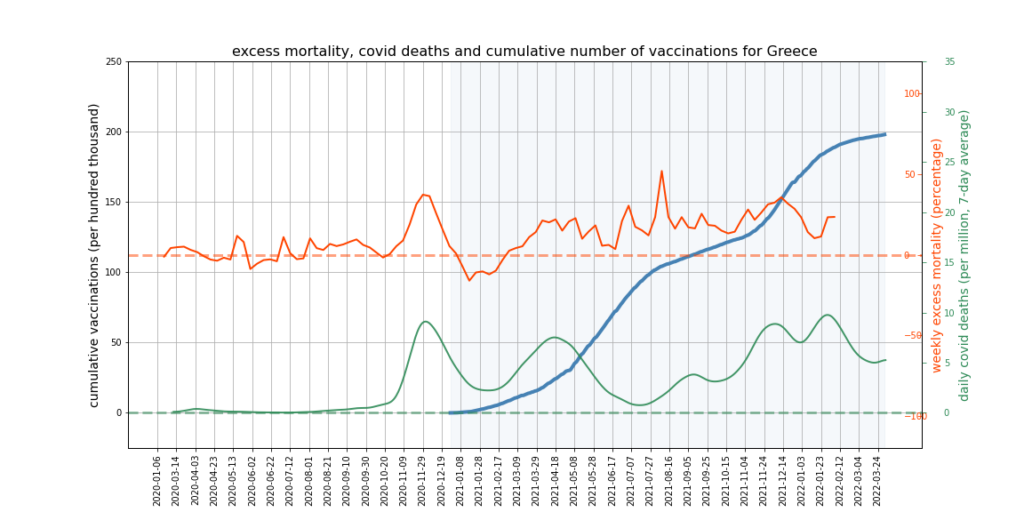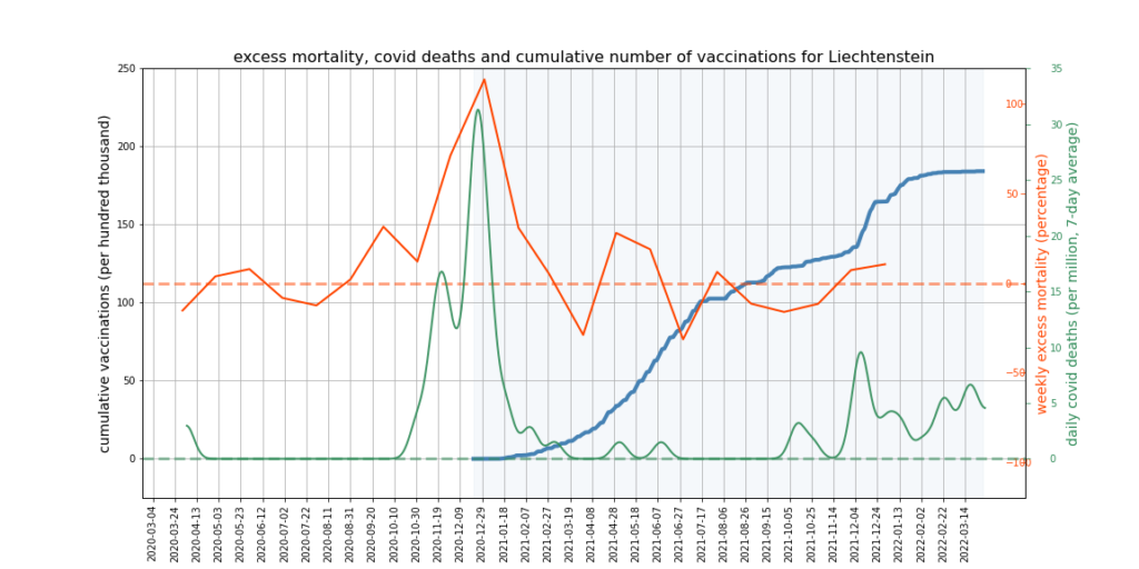 The graphs below show Covid deaths, excess deaths and vaccine doses for 42 countries, mostly in Europe but also Australia, New Zealand and Israel. In many of them a broad rising trend in excess deaths is discernible since the vaccine rollout began, with some more pronounced than others. The large impact of Covid waves and mortality displacement is also clearly visible. In many of the countries, the rollout (particularly to the elderly) was done during the winter 2020-21 Covid wave, obscuring a potential vaccine injury signal, and the subsequent mortality displacement has a similar effect. In Australia and New Zealand, the very mild winter ‘flu season’ (when flu was not around) during the rollout in 2021 resulted in low excess deaths in some of the colder months such as September, also obscuring a possible signal – though notably the winter months of June and July and, in New Zealand, August did not have the low mortality you would expect in a winter without flu. In the northern hemisphere, excess mortality in the winter just past was depressed by the mildness of Omicron, again obscuring a possible signal.